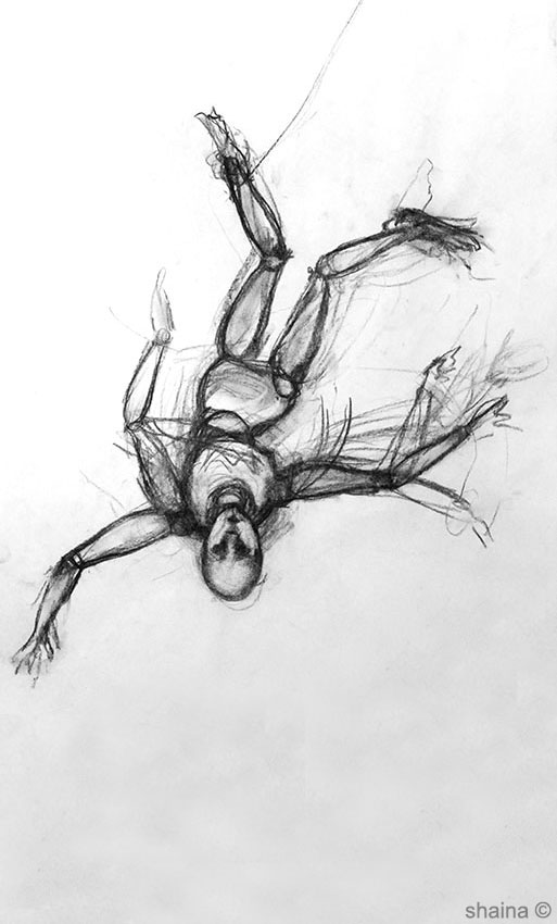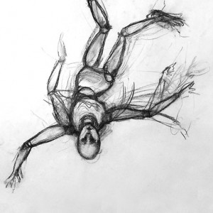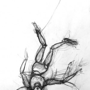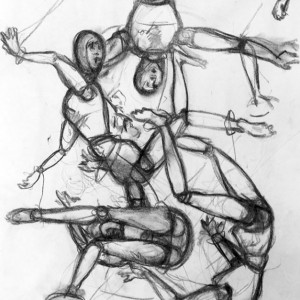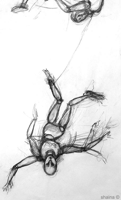 Free Falls: The Entangled Dummies, pencil and charcoal 40 x 60 cm