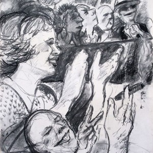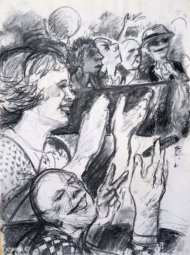 3 Eggheads in the Crowd, charcoal 40 x 60 cm