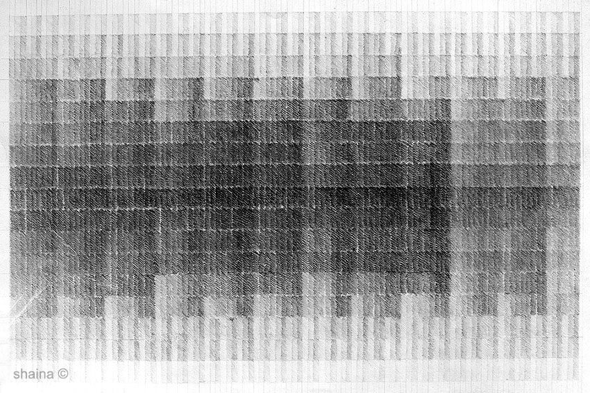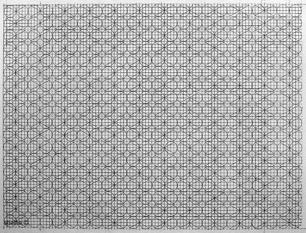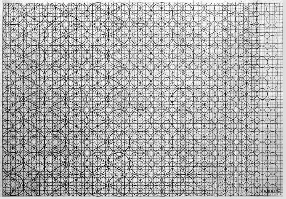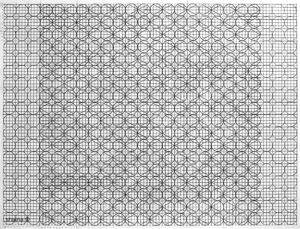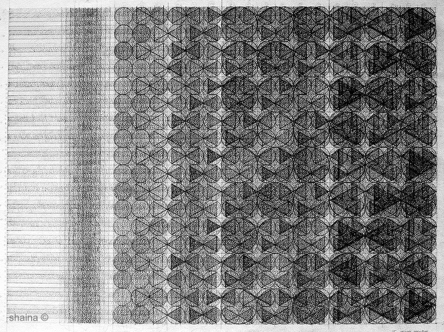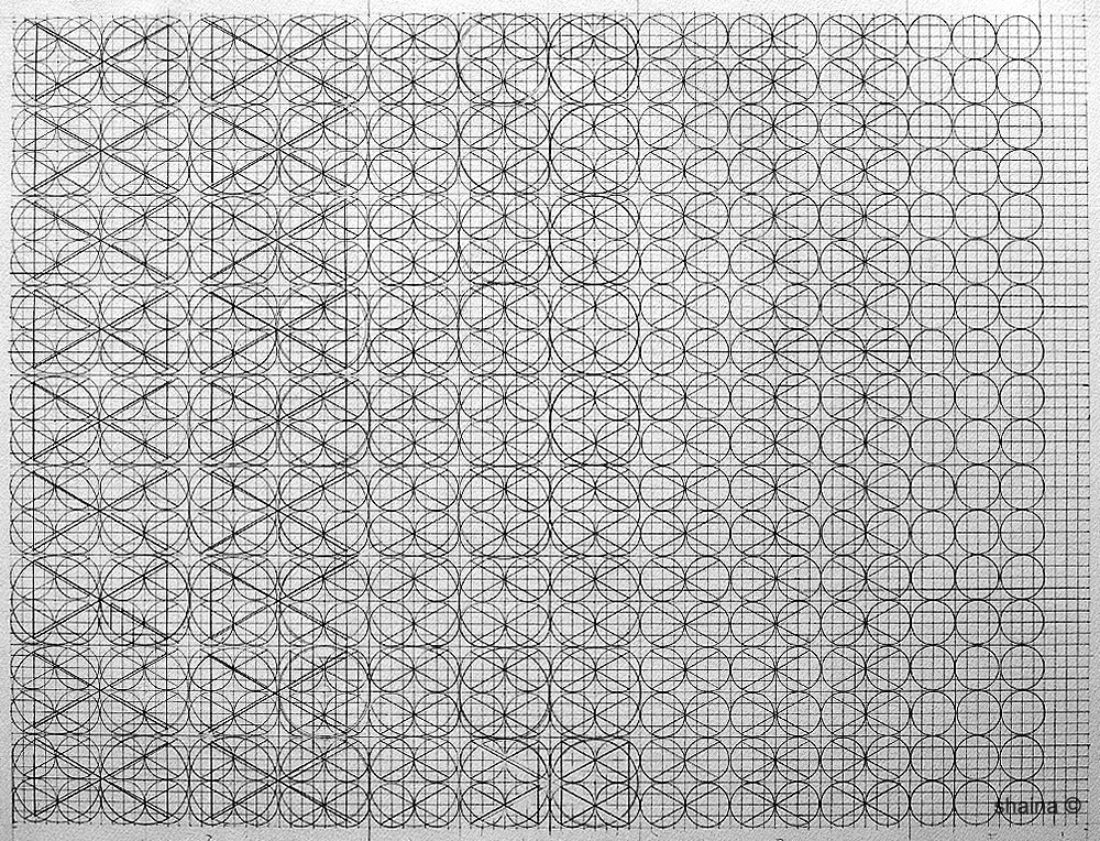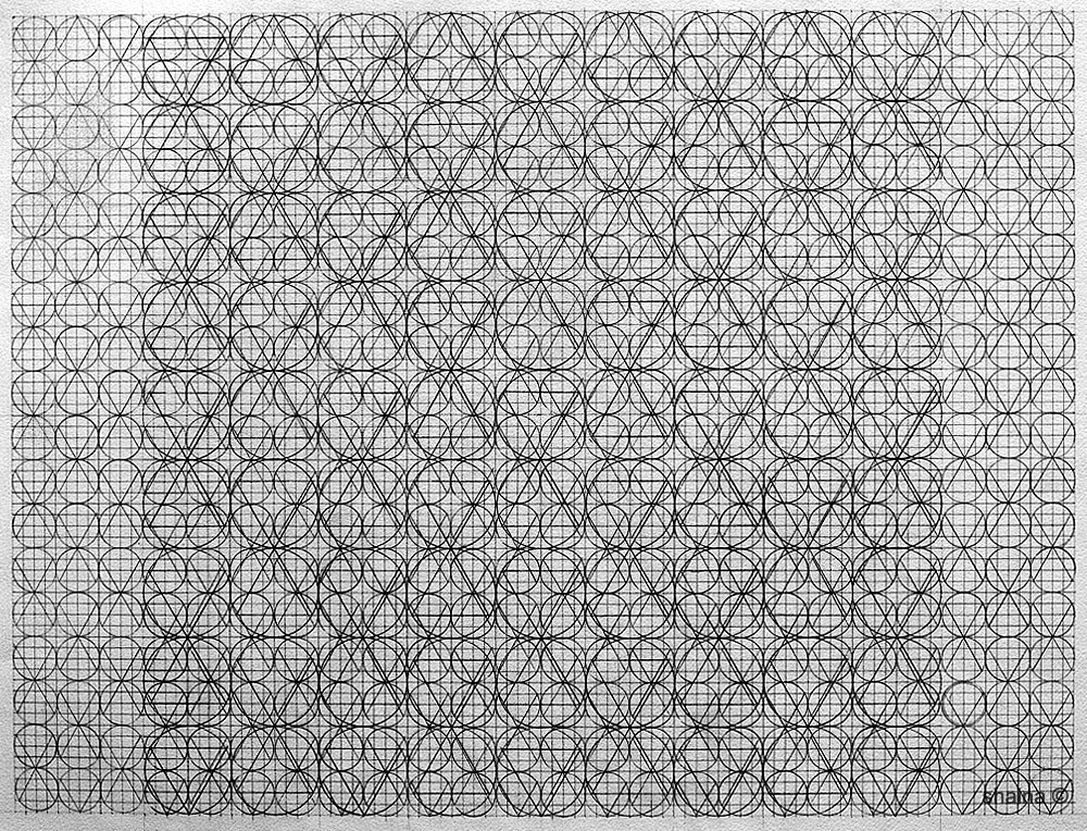Structure Drawings: Lines of Development are a series of drawings on grids created by hand. Thesis : A combination of lines and basic shapes (dot – circles, triangles, squares) form the basis of all organic form and man-made structures, from simple to complex. Systematically overlapped and multiplied, different patterned complexities endlessly develop as I continue to choose one of the next (of many) possible “logical moves”.
