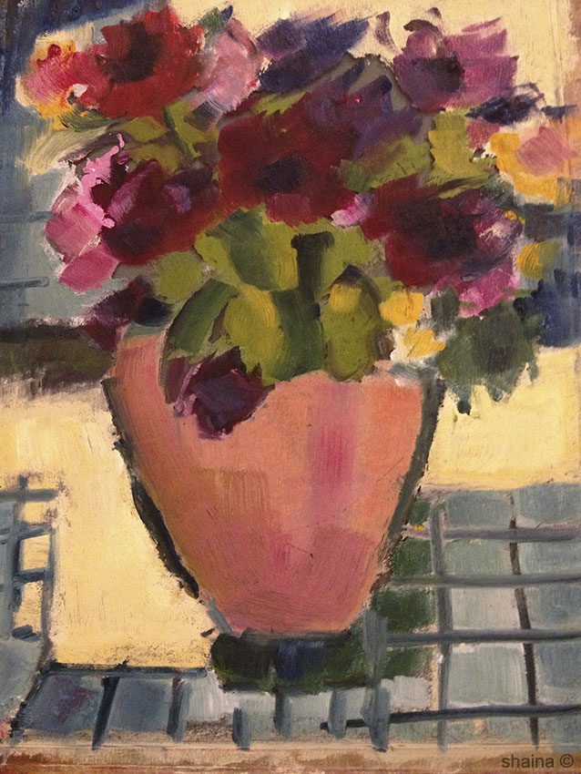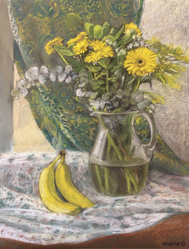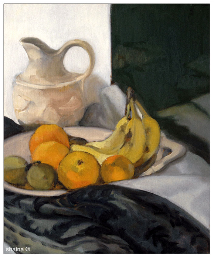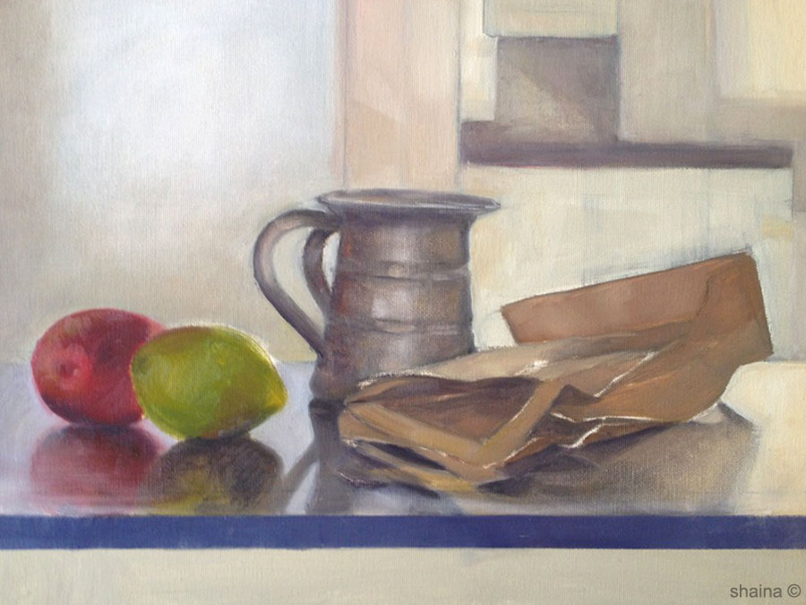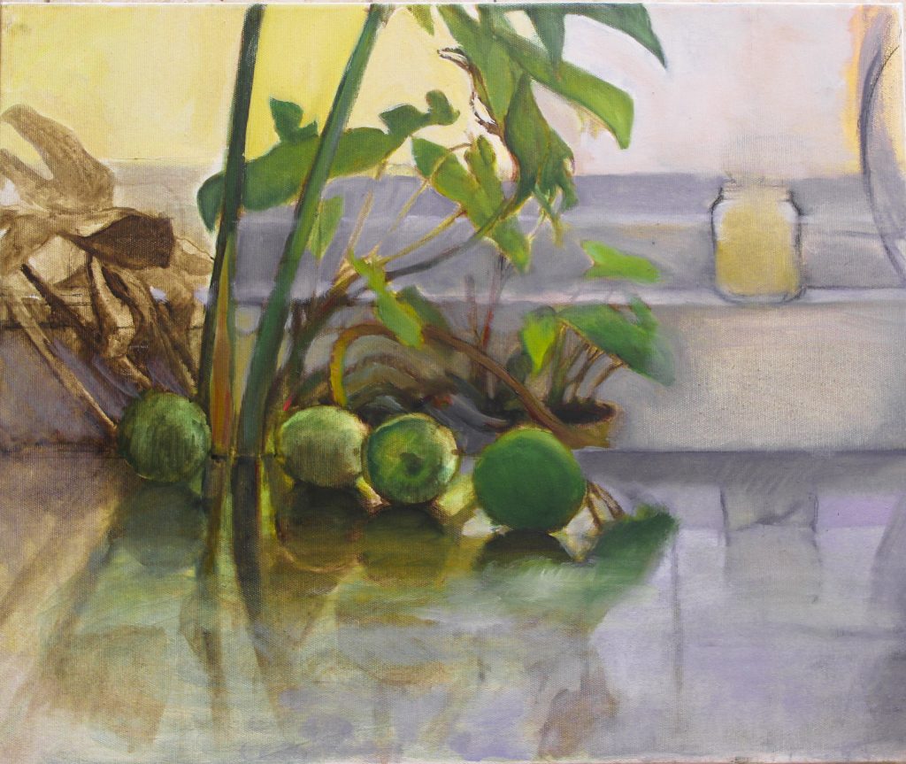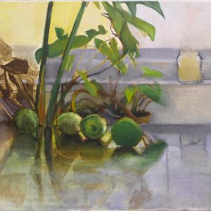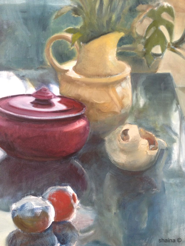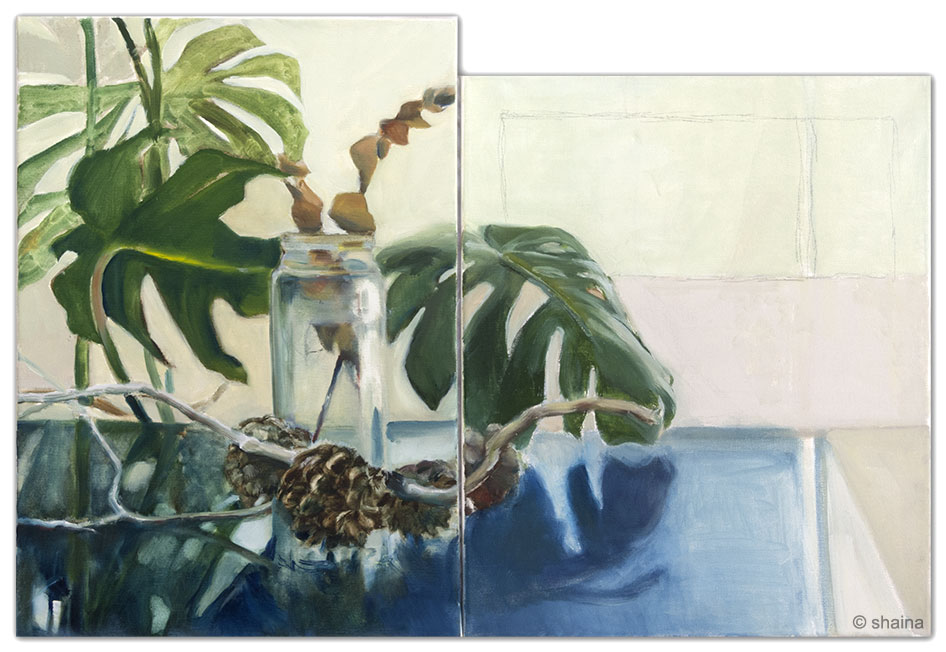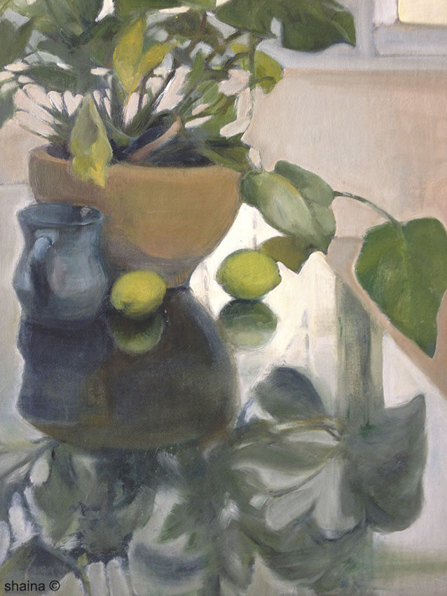These still life paintings are studies in mysterious patterns of reflections and natural forms.